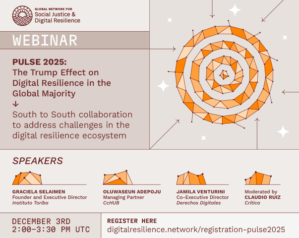 A Rede Global por Justiça Social e Resiliência Digital gostaria de convidar você para o webinar <https://digitalresilience.network/registration-pulse2025/>: Pulse 2025: The Trump Effect on Digital Resilience in the Global Majority, South to South collaboration to address challenges in the digital resilience ecosystem. O encontro acontecerá em 3 de dezembro, das 11 às 12:30 (horário de Brasília) / 2 - 3:30 PM UTC.